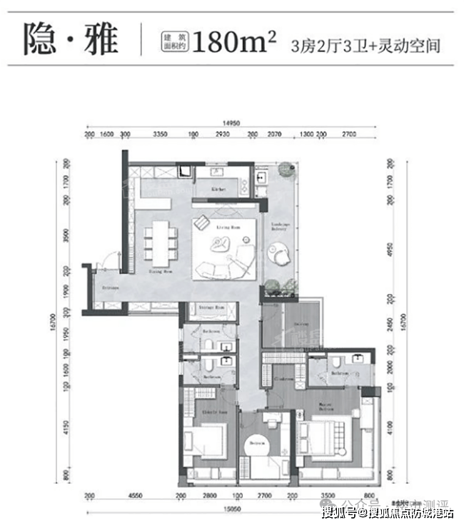 最后是约180平方米的四房两厅三卫户型,这是该项目中的旗舰户型,专为追求极致品质的家庭打造。户型采用东南朝向,双主套设计,即两个卧室均配有独立的卫生间,充分满足了多代同堂或二胎家庭的隐私需求。卧室拥有270°的景观视野,无论是清晨的第一缕阳光,还是傍晚的绚烂晚霞,都能尽收眼底。低楼层的户型虽然在景观上可能受到一定影响,但考虑到项目整体的规划设计和绿化布局,依然能够提供不错的居住体验。这款户型的空间尺度宏大,功能分区明确,每一个细节都彰显着奢华与尊贵。