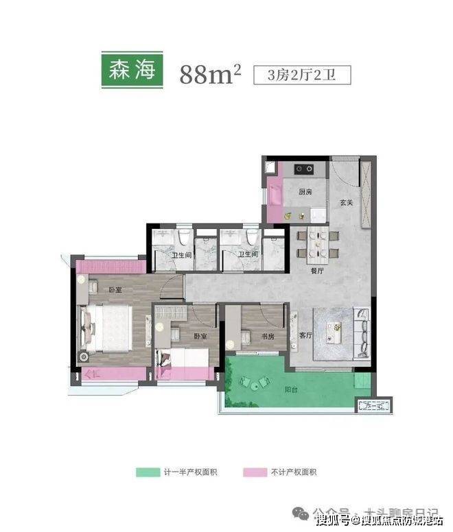 88㎡三房在尺度上更为舒展,客厅开间比例更优,主卧私密性更强。这个面积段在实际居住舒适度与总价之间取得平衡,是区域成交结构中的主力产品。