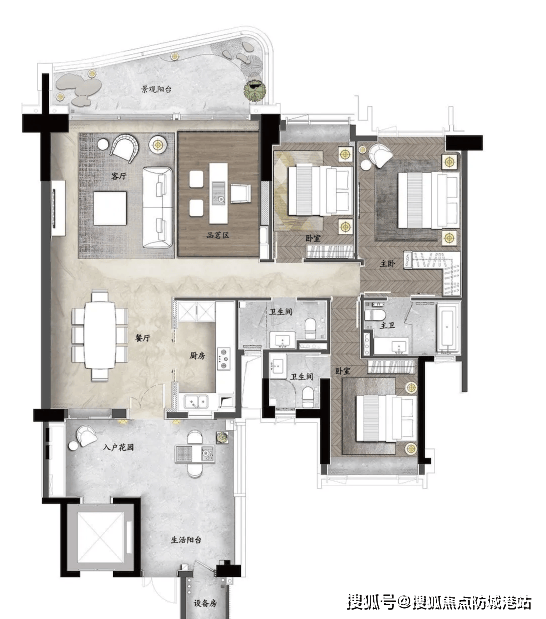 B户型约200㎡一线临江大宅,同样享有270°三江视野,独立电梯入户搭配多功能入户花园,简约半开放式厨房兼顾实用与美观,阔绰双主套房保障居住私密性,R9栋该户型为开放式3+1房交付,客厅与书房打通后开间可拓展至7.2米,空间灵动性十足。C户型约140㎡南向园景大宅,性价比出众,三卧室朝南设计保证充足采光,独立电梯入户,双主套房配置,让刚需也能享受豪宅品质。