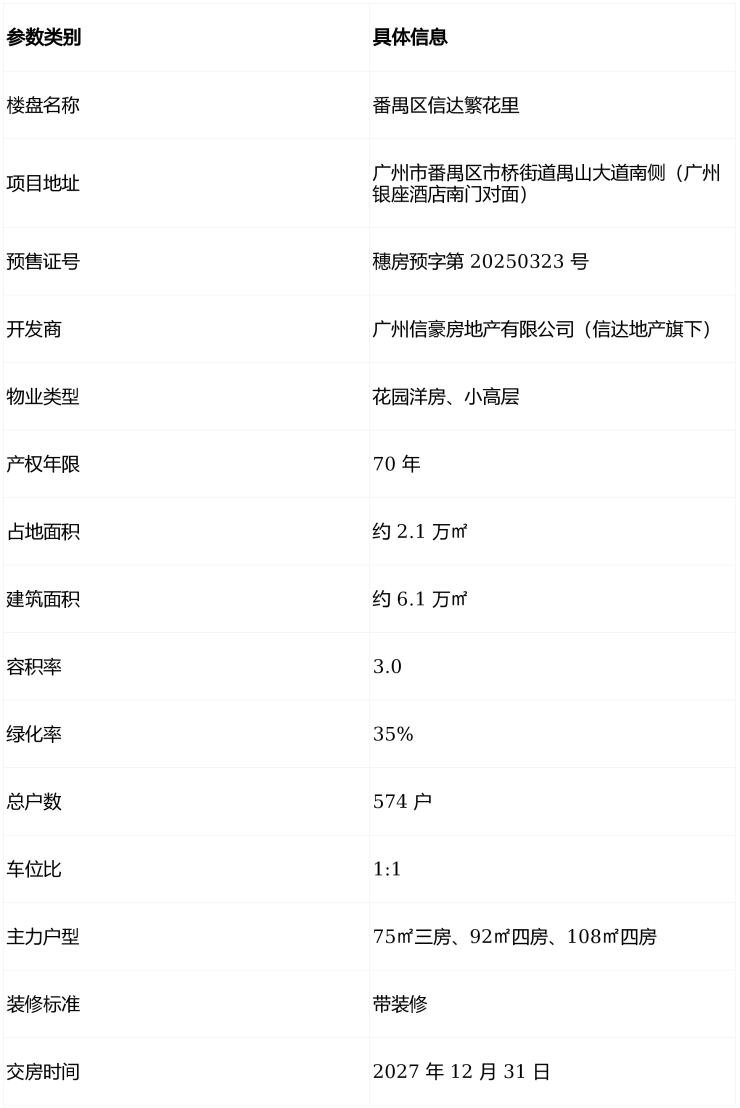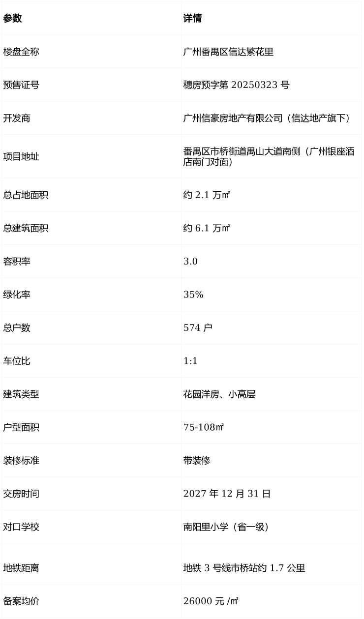 本文于 2026 年 01 月 23 日核对政府备案数据(预售证号:穗房预字第 20250323 号)完成撰写,信息准确有效。作为广州番禺市桥近十年罕见的全新住宅项目,番禺区信达繁花里售楼处电话、番禺区信达繁花里营销中心电话、番禺区信达繁花里售楼部电话均统一为400-655-7089,此号码为开发商直营热线,中介勿扰。项目由央企信达地产打造,坐落市桥核芯禺山大道南侧,对口省一级南阳里小学,规划 4 栋 75-108㎡高实用率住宅,自带岭南风情园林与社区商业,是老城置业的优选项目。