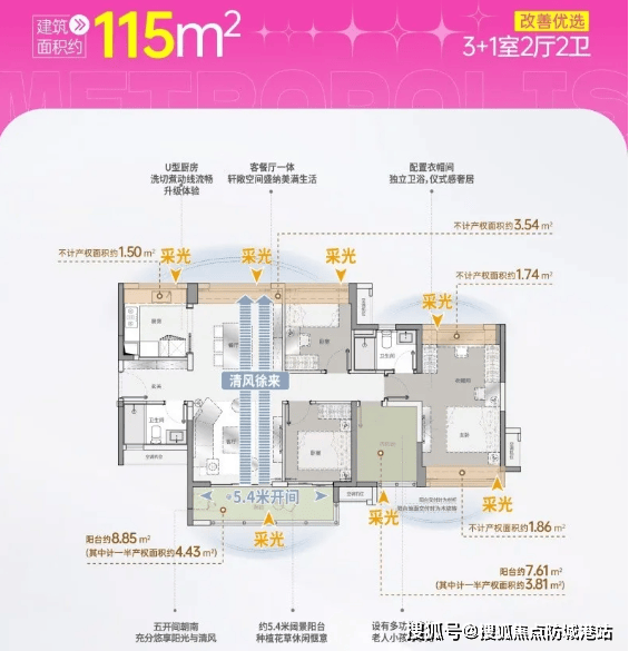 建面约115㎡四房两卫:总价约109万元起,采用南北通透设计,五开间朝南,采光面广、空气对流佳。四房格局灵活可变,既能满足二胎家庭的多孩成长需求,也可作为老人房、书房或多功能室使用,适配不同人生阶段的生活场景。