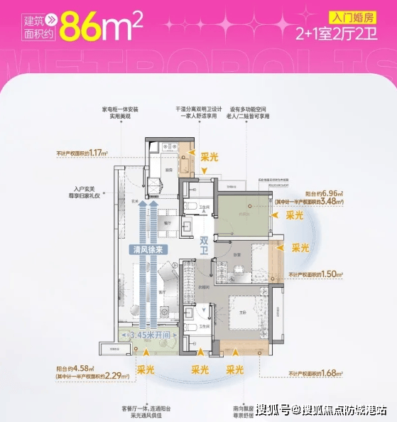 建面约86㎡三房两卫:总价约82万元起,格局紧凑高效。主卧配备独立卫浴,实现双卫配置,在同面积段产品中极为罕见。适合新婚夫妇或首次置业的年轻家庭,以较低门槛享受高品质三房生活。