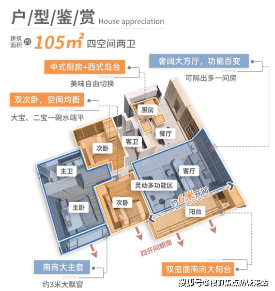 105㎡四房两厅两卫:当前主力在售户型,剩余约25套。采用LDK(客厅+餐厅+厨房)一体化设计,空间通透感强,套内层高舒适,高楼层可远眺珠江景致。3梯6户配置有效减少候梯时间,全屋配备中央空调与智能家居系统,无论是三代同堂还是需要独立办公空间的家庭,都能从容应对。