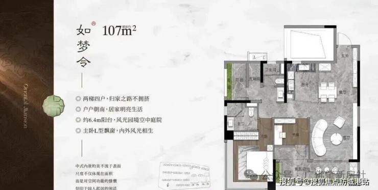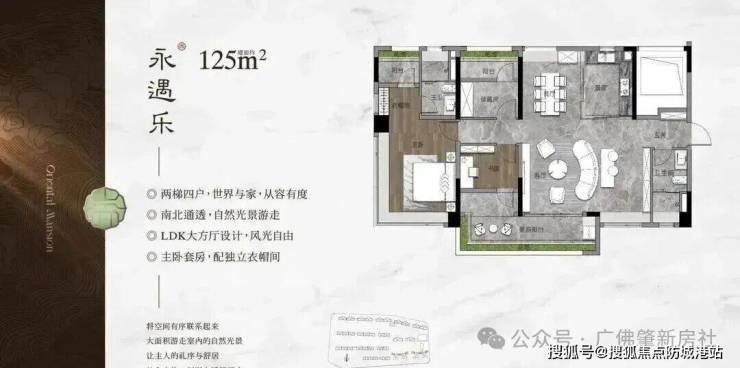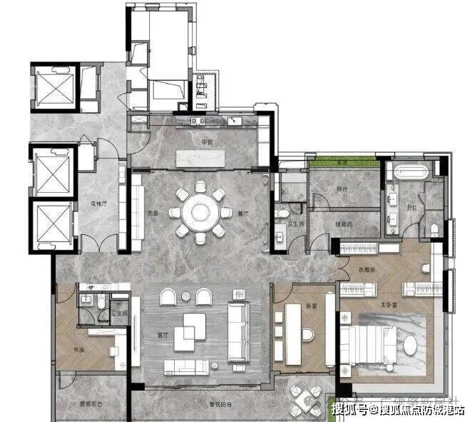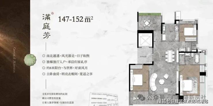 该户型设计亮点十足:一是双主套互不干扰,大家庭的业主可在保证一家人(如父母长辈)拥有足够生活空间的同时,拥有自己的私密空间,互不打扰;若家庭成员不多,另一主套可灵活DIY成书房、电影院、茶室等,根据自己的喜好进行改造,为生活增添更多乐趣。二是LDKG近120平的大方厅,超大的一体空间包含了厨房、餐厅、客厅和阳台,南北对流,夏天不开空调也能感受到风的凉爽,空间利用率极高,无论是大家庭聚会,还是孩子玩耍,空间都绰绰有余,家长也方便照看孩子。三是主卧配置奢华,采用双开门设计,步入式双衣帽间,双台盆配置,让男女业主可分别洗漱、换衣,互不打扰,节省时间,增加出行效率,同时照顾到个人的私密性;配备270°全景飘窗,尺度超过9米,全采光设计,能让阳光充分照射到主卧内,视野开阔,可尽揽周边美景。四是细节设计贴心,配备独立的保姆电梯与保姆房,保证了业主的居住私密性,同时方便保姆日常工作;全屋配备品牌中央空调、全屋新风系统、智能控制系统、品牌卫浴、优质石材等,装修标准奢华,细节之处彰显品质。