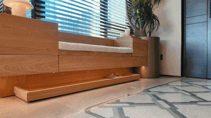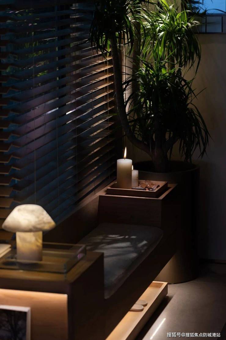 主卧套房:以燕麦、奶油与浅焦糖为主色,暖木地板、粗织毛毯与手工编结披毯叠加肌理,营造松弛而有温度的触感层次。尺度充裕的落地窗被纱帘与可调百叶共同管理光线,清晨引入柔和晨光,夜晚则安静收束。窗边设置长榻与梳妆台一体化设计,阅读、梳妆与小酌都能在此完成。通往露台的滑门将江景纳入卧室日常,躺椅与小几定义了私人观景席位,让休息从床的边界延伸至夜色之中。