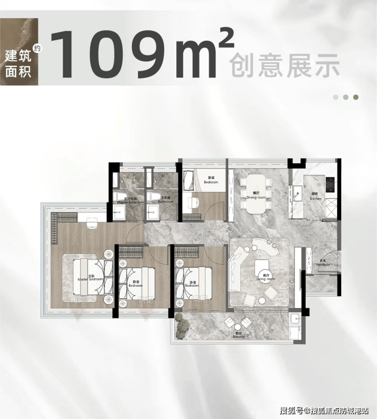 建面约109㎡四房两卫:主打南北对流设计,通风采光效果极佳,4.5开间朝南搭配双面宽大阳台,客餐厅尺度阔绰,空间通透感十足。两个次卧均能实现三边下床,包容性强,适配多孩家庭;玄关处规划800库收纳空间,有效提升居家收纳能力,同时次卧可与客厅打通,改造为宽厅三房格局,满足家庭不同阶段的居住需求。