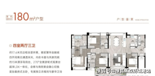 建面约180㎡四房两厅三卫户型,作为项目高端户型,打造极致奢阔居住体验,适合追求高品质生活的高净值家庭。户型整体空间开阔,布局合理,客厅连接超大观景阳台,尽览金融城城景风光;长辈套房设计贴心,配备独立卫浴与电热毛巾架,保障长辈居住舒适与便捷;全屋配备新风系统、中央空调、3层夹胶隔音玻璃等设施,打造安静、舒适、健康的居住环境。卫浴空间采用德国唯宝百年高端品牌,配备智能马桶、浴缸等设施,彰显奢华质感;步入式衣帽间、家政柜、备用鞋柜等收纳空间充足,满足家庭收纳需求。
