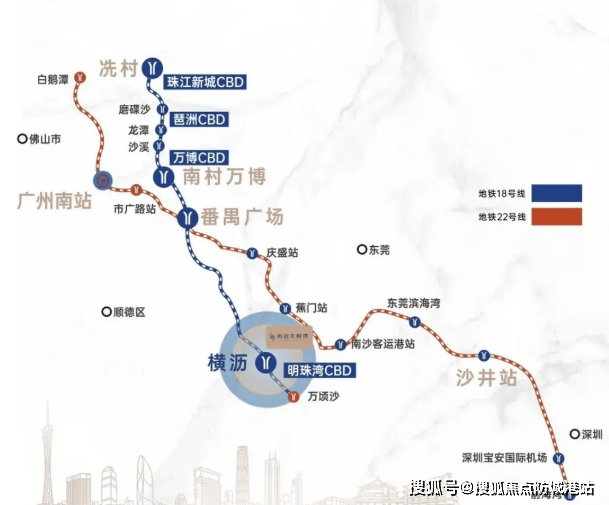 项目所处的横沥岛板块,是南沙“一核一带一区”空间格局中的重要节点。依托地铁18号线这一湾区南北交通大动脉,从横沥站出发,仅2站即可抵达珠江新城,高效串联琶洲、金融城、白鹅潭等广州四大CBD,通勤效率远超传统郊区盘。对于在市中心工作的都市精英而言,这里既享湾区发展红利,又不失生活宁静,真正实现“工作在中心,生活在湾区”。