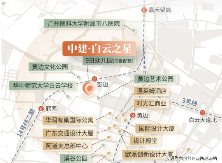 四纵四横交通,半小时生活圈:四纵四横立体化轨交,2号线/3号线/14号线二期(建设中)三地铁加持。距黄边站约800m,3站白云新城,直达江南西,广州南。14号线二期约300米、鹤南(建设中)直线距离约800米,直达火车站。临近空港大道,自驾去白云新城仅需10分钟。这种“立体交通网络”的生活体验,是普通楼盘无法比拟的。