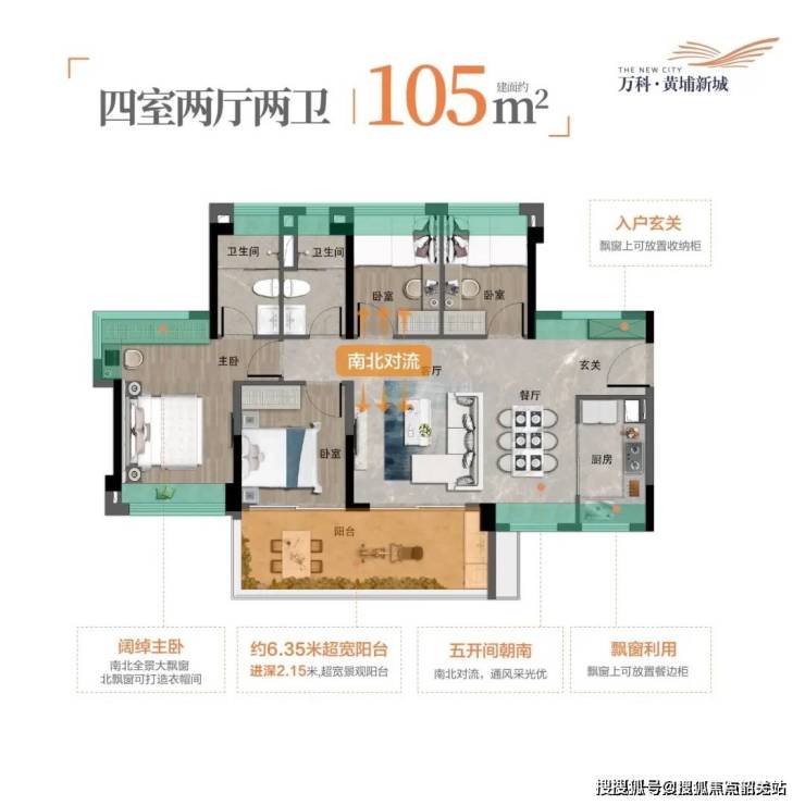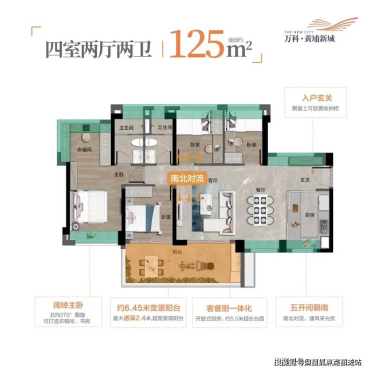 125㎡四房:四开间朝南,双阳台设计,次卧可改造为书房或儿童房,总价388万起。