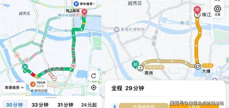 答:越秀・熙悦江湾拥有双地铁交汇的核心交通优势,项目直线距离广州地铁 11 号线棣园站仅约 250 米,步行距离约 600 米,步行 8 分钟即可抵达;直线距离广佛线燕岗站约 400 米,步行距离约 600 米,步行 10 分钟即可抵达。两条地铁线路均可不换乘直达珠江新城、金融城、琶洲等核心商务区,其中乘坐 11 号线 8 个站可直达琶洲,耗时约 27 分钟;11 号线转 3 号线 8 个站可抵达珠江新城,耗时约 29 分钟。项目周边紧邻工业大道、环城高速等城市主干道,自驾 30 分钟内可通达琶洲、珠江新城,交通出行极为便捷。