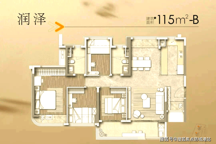 3. 115㎡四房两厅两卫(改善主力款):总价520万起,主打改善体验,适配多孩家庭或有居家办公需求的家庭。根据备案数据显示,该户型采用五开间朝南且南北对流设计,采光通风效果拉满,整个户型通透开阔,没有暗房,居住舒适度极高;采用LDKG一体化设计,打造超60㎡家庭核心区,客厅、餐厅、厨房、阳台相连,空间开阔,适合家人聚会、休闲娱乐,也能满足多孩家庭的日常活动需求。同时,部分卧室可灵活打通,既能作为独立卧室,也能根据需求改造为大主卧、书房或儿童房,适配多孩家庭或居家办公的需求,得房率超100%,在同面积段改善户型中,空间利用率和舒适度都处于领先水平,对于追求居住品质的改善家庭来说,是十分合适的选择。