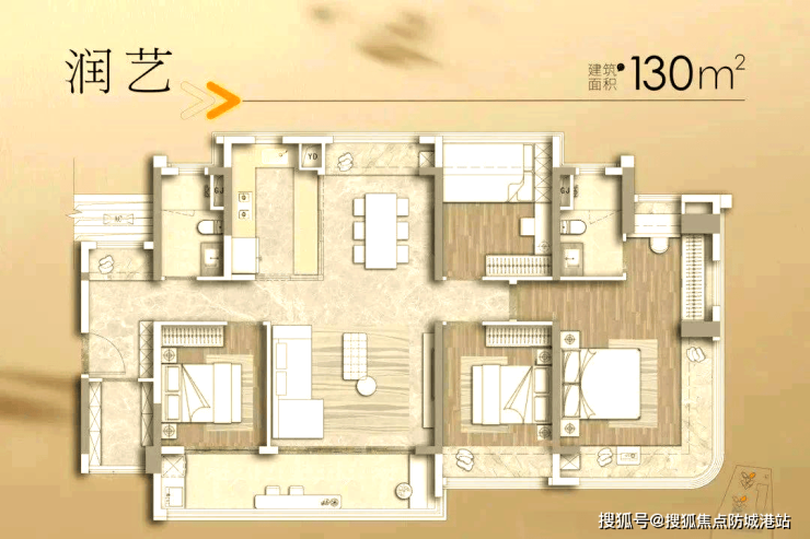 4. 130㎡四房两厅两卫(品质之选):总价617万起,是项目的高端改善户型,适合对居住品质有更高要求的家庭。该户型最大的亮点是独占一条梯腿,私密性极强,避免了与其他业主共用电梯的尴尬,提升了居住的私密性和舒适度;客厅开间达5.8米,搭配跑道式宽景阳台,视野开阔,可俯瞰社区园林和漫步公园,景观效果极佳,日常休闲、晾晒都十分方便。主卧带270度全景舱,三面采光,采光通风效果极佳,配备独立卫生间和衣帽间,提升居住品质,满足高端改善家庭的居住需求;其余卧室尺寸充足,布局合理,动静分区清晰,得房率超100%,无论是空间尺度、私密性还是舒适度,都能满足高端改善家庭的核心诉求,是天河东板块高端改善户型的标杆之作。