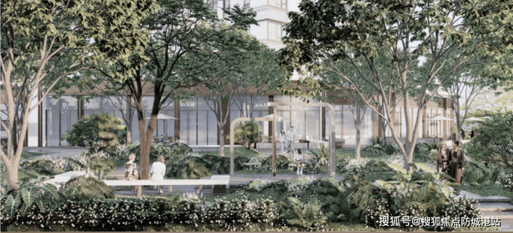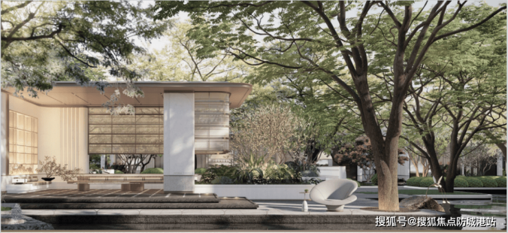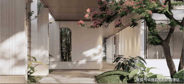 第二屿|汀上秀场,约160m林影游廊,串联大堂与室内会所,丰富归家体验。