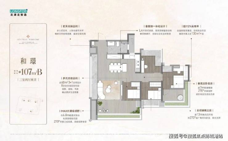 建面约95㎡三房两厅两卫,传统户型,使用率约110%,主人房270°采光景观面。