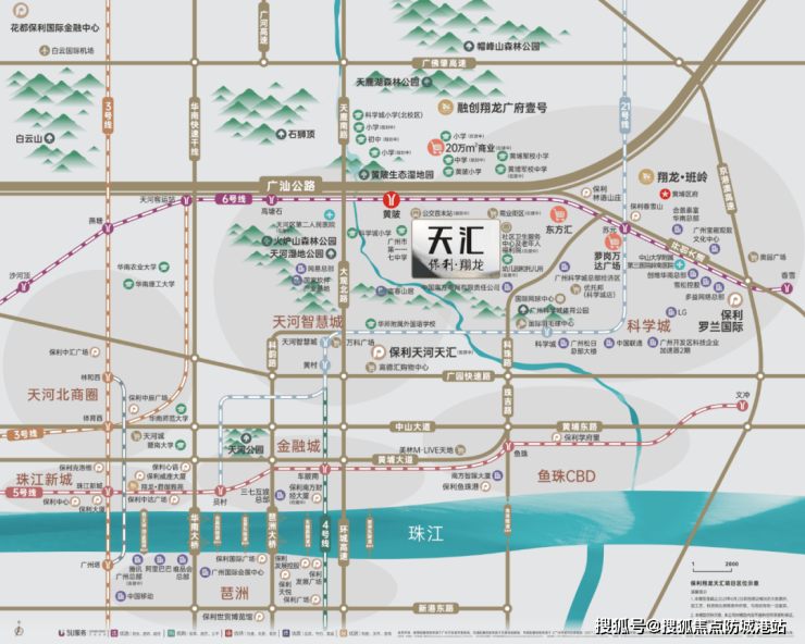 保利翔龙天汇位于广州第三发展中轴线“科技创新轴”核心,地处天河智慧城与黄埔科学城交汇地带,3公里内覆盖珠江新城、金融城、琶洲三大CBD。项目紧邻地铁6号线黄陂站(直线距离400米),步行5分钟直达地铁站,6站换乘3号线,通勤天河仅需20分钟。自驾通过广汕路、广园快速、广佛肇高速等主干道,40分钟内可达天河城、太古汇等核心商圈。
