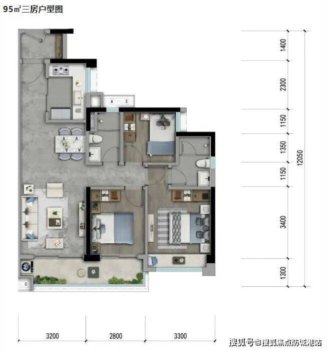 95㎡三房:在空间上更为舒适,为家庭生活提供更多便利。