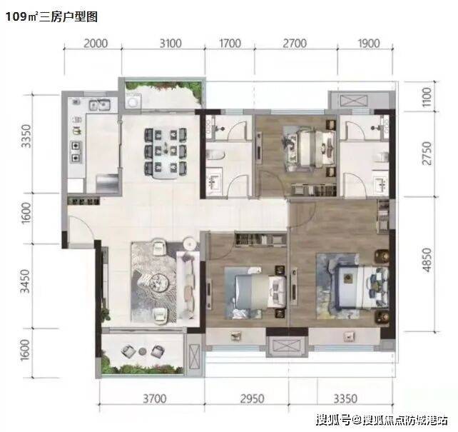 109㎡三房:进一步优化,无论是起居还是收纳空间都更为充裕。