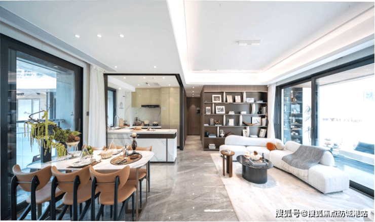 景观阳台是该户型的灵魂所在。面宽近九米,进深约二点四米的超大阳台,宛如一个空中花园。业主可以在这里布置绿植、摆放桌椅,打造一个私密的户外休闲空间。清晨在这里打坐冥想,呼吸新鲜空气;傍晚在这里品茶赏月,欣赏城市夜景。阳台的多功能性,让室内外的界限变得模糊,生活与自然无缝衔接。客厅采用了LDK一体化设计(客餐厨一体),空间通透开阔,适合举办家庭聚会或朋友派对。餐厅与厨房相邻,传菜方便,互动性强,让烹饪和用餐成为一种享受。
