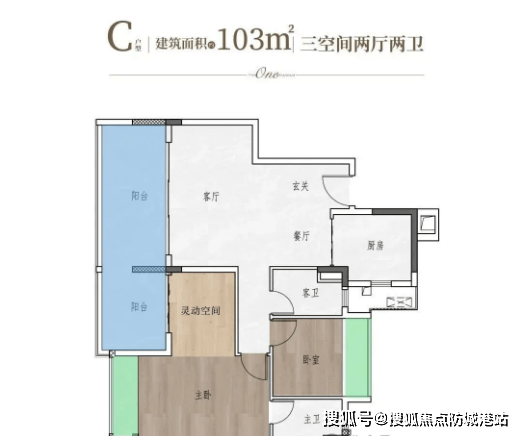 建面约103㎡三房两厅两卫,在空间利用率上进一步升级,实得面积堪比旧规120㎡户型。户型布局方正,动静分区明确,公共区域与私密区域互不干扰;客厅与餐厅相连,形成开阔的活动空间,适合家庭聚会;主卧配备步入式衣帽间与独立卫生间,提升居住质感;次卧空间充足,可满足老人同住或儿童成长需求。该户型单价2.1万-2.4万/㎡,是刚改向改善过渡的优质选择。