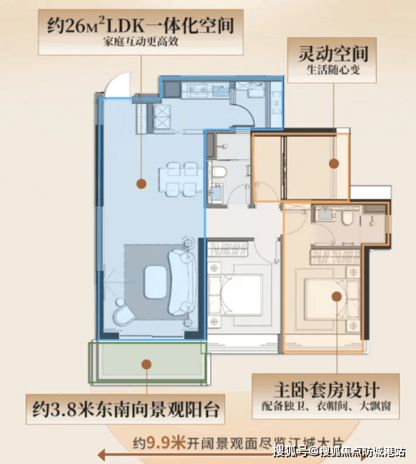 87平米小户型:虽然空间有限,但做到了“麻雀虽小,五脏俱全”,并且比市面上同类产品更具优势。少承重墙化设计,次卧可打通或隔开,生活阳台也能与厨房打通,形成全明空间。主卧配有独立卫浴,增加私密性。