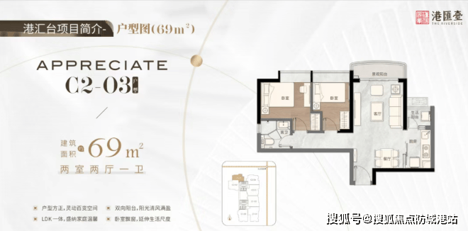 69㎡双阳台两房两厅一卫,户型方正,空间灵活多变。
