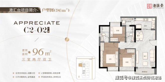 96㎡纯南向三房两厅两卫,动静分区,L型厨房设计,动线合理。