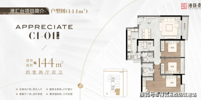 144㎡四房两厅二卫,东南向户型,阳光充足,视野开阔。