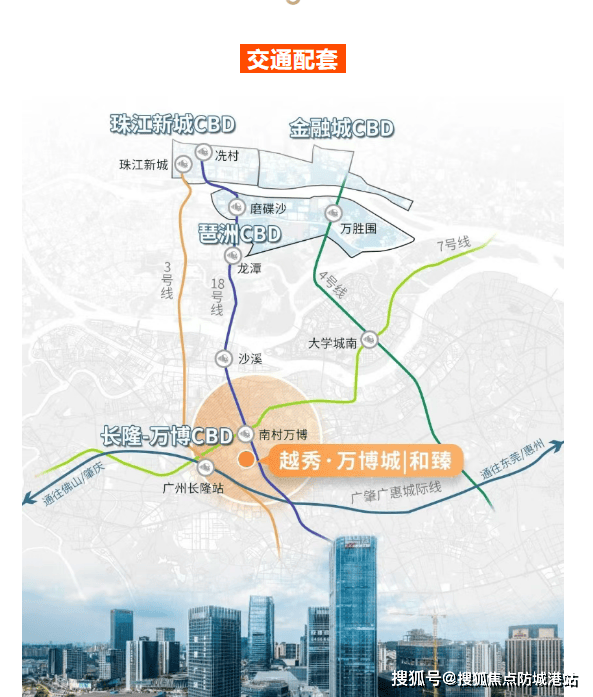 越秀·万博城周边交通便利,地铁3号线、7号线、18号线等多条轨道交通线路交汇,步行至南村万博站约1.2-1.3公里,可便捷到达琶洲、珠江新城等地。自驾出行也非常方便,项目位于汉溪大道旁,紧邻番禺大道和南沙港快速,整体可实现30分钟内到达琶洲和珠江新城。