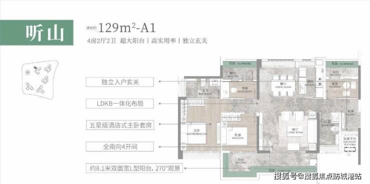 建面约129㎡户型:阳光玄关设计,兼容户内的私密性和全明采光,符合广东地区对风水的理解。