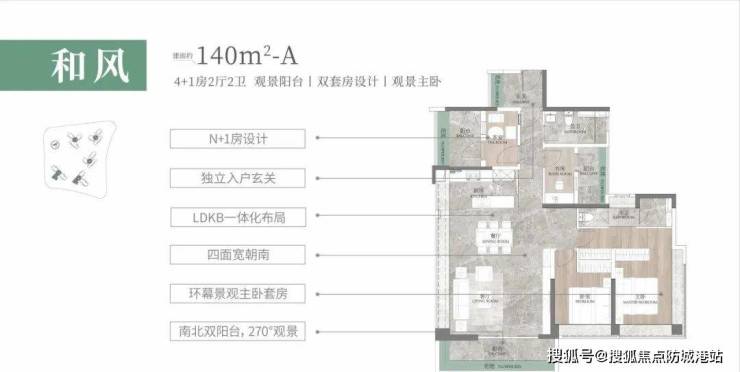 建面约140㎡户型:主卧三面采光,观景角度扩大到270°。
