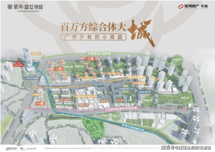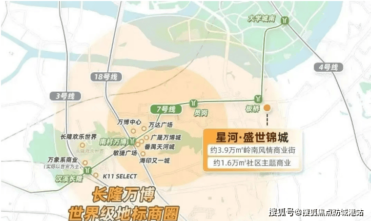 星河・盛世锦城坐落于番禺万博板块余荫山房北侧,地处南大干线经济带核心财智走廊之上,是番禺主城范围内少有的百万方级低密生活大城。南大干线作为番禺贯穿东西的城市发展主轴,串联起广州南站、长隆万博、国际创新城、番禺汽车城四大千亿级产业平台,形成强大的产业联动效应与人口集聚效应。项目所处位置,既承接万博 CBD 的商业、商务、人口外溢红利,又享受国际创新城高校资源与科创产业赋能,同时占位番禺旧改核心区域,城市更新持续推进,区域面貌与配套能级不断提升。