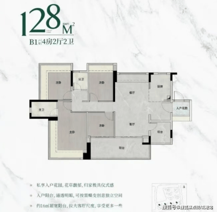 128㎡四 + 1 房户型配备独立入户花园,提升归家仪式感与收纳空间,厨房、客餐厅、主卧尺度大幅拓宽,空间感更为奢阔,功能分区合理,动线流畅,完全满足改善家庭对空间尺度与居住品质的高要求。