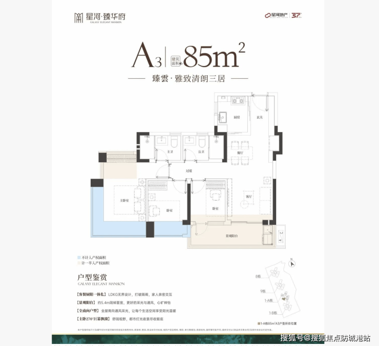- 85㎡三房:三开间朝南,LDKG宽厅,270°观景主卧,小面积大格局;