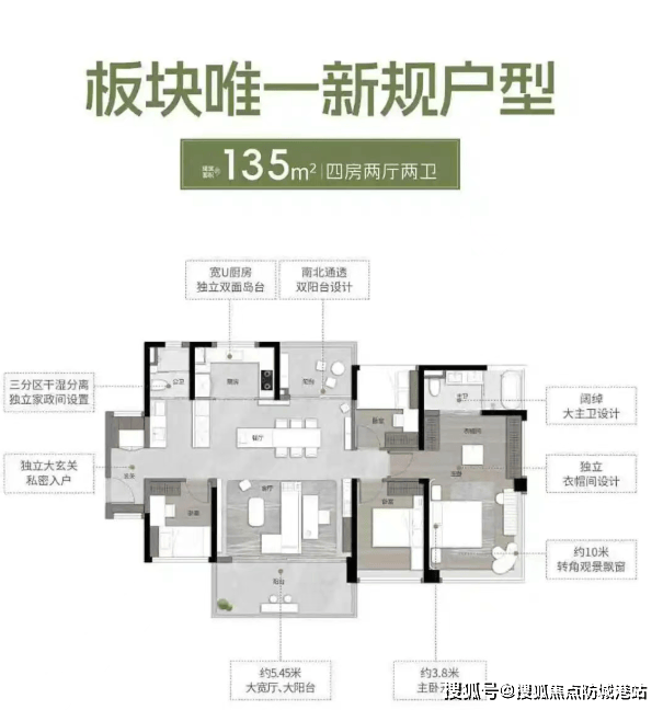 约135㎡户型作为板块内的“楼王”产品,采用了南北通透双阳台设计,自带约5.25米大宽厅以及约5.45米大阳台。主卧开间约3.6米,几乎追平了不少紧凑三房的客厅开间。作为唯一的新规产品,其使用率最高可达约138%,放眼整个板块没有对手,真正实现了“买多少送多少”的超值体验。