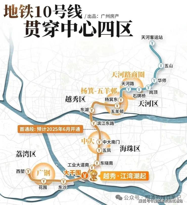 项目出行便利度,是衡量其区位价值的硬指标。越秀江湾潮起周边已形成多维交通体系。轨道交通方面,项目距离已开通运营的地铁10号线大干围站直线距离约650米。10号线作为串联天河、越秀、海珠、荔湾四大中心组团的“加密线”,其价值正在显现。实测数据显示,从大干围站出发,4站可达中山大学站,9站可抵达珠江新城站,通勤天河CBD的时间可控制在30分钟地铁车程内。此外,周边约1.2公里范围内还分布有地铁2号线南洲站、广佛线石溪站,形成换乘网络。
