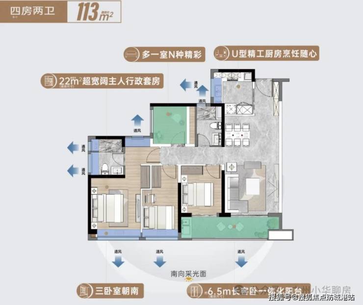 户型设计上,越秀星寰TOD做了一个很大的突破:户户朝南。在广州,南北通透是标配,但“全南向”却很少见。尤其是89平米做到三房,113平米和112平米做到四房,而且全是四开间朝南的设计。这意味着,无论是一家人住在哪个房间,都能享受到充足的阳光。这种设计极大地提升了居住的幸福感,尤其是在广东这种回南天比较多的地方,阳光就是最好的除湿剂。