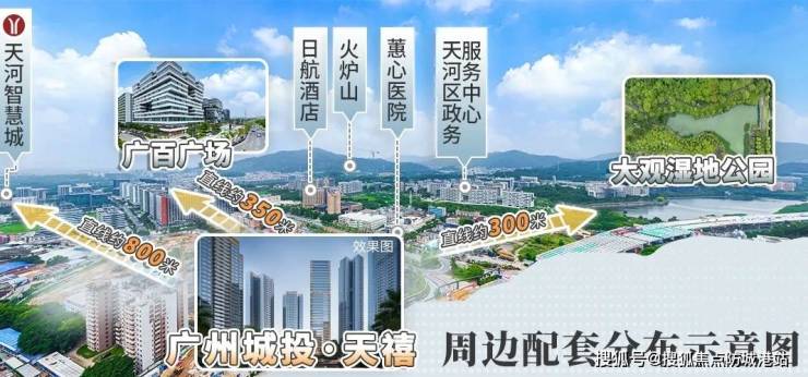 城投·天禧的地理位置优越,坐落于广州天河智慧城核心区,紧邻华观路与大观中路交汇处。项目四周分别向东、南、西、北辐射出多个重要功能区: