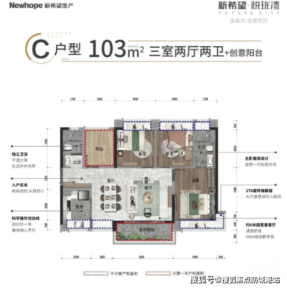 C户型:103㎡四房两厅两卫,满足三代同堂需求,户型方正无缺角,赠送面积多,居住舒适度高。