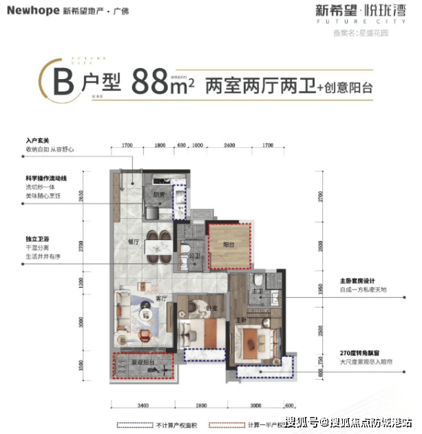 B户型:88㎡三房两厅两卫,南北通透,价格区间在190-210万元之间,是婚房的最佳选择,直望花园景观。