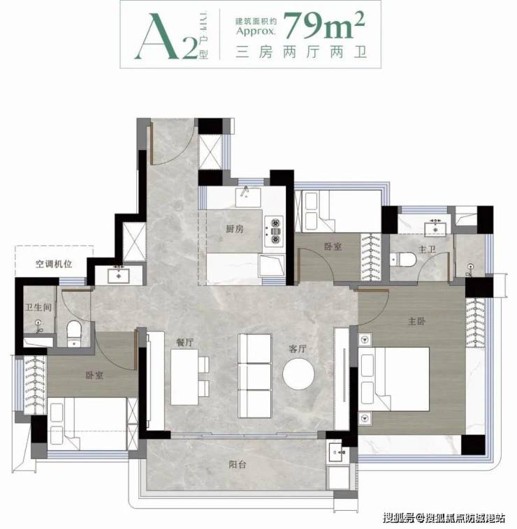 项目主推79-142㎡三至四房,涵盖12种户型,得房率高达125%(市测绘中心报告编号GZ2025CH018)。以79㎡A1户型为例: