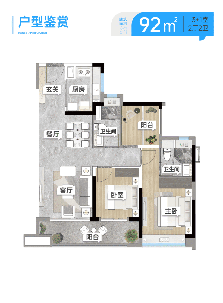 建面约92平三房,户型不大,却做到四开间朝南,采光和通风优秀,且是主套设计,带独立卫浴。