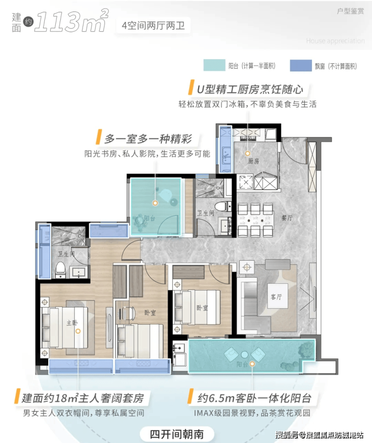 建面约113平四房,除了四开间朝南,更做出约6.5米大阳台,带来巨幅采光,观景效果也震撼。