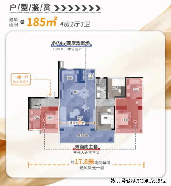 建面180-185㎡四房两厅三卫户型面向品质改善客群,主打高端居住体验。3梯3户设计大幅提升居住舒适度,避免了早晚高峰等待电梯的烦恼,保障了出行效率与私密性。南北对流布局让室内通风效果出色,即使在炎热的夏季,也能保持空气流通,带来清爽舒适的居住体验。