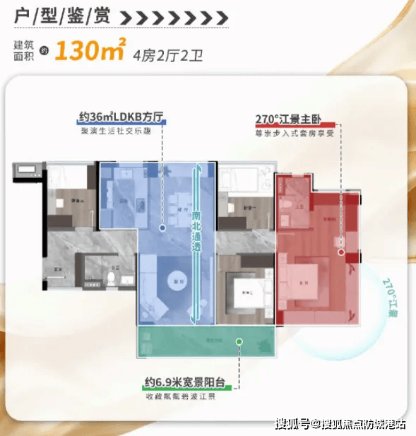 LDK一体化客餐厅设计是该户型的核心亮点,将客厅、餐厅、厨房融为一体,空间开阔通透,既能满足家庭聚会、亲友宴请的需求,又能增强家人之间的互动交流,打造温馨的家庭氛围。部分户型拥有270°江景视野,将珠江壮阔景致与城市天际线尽收眼底,进一步提升居住质感与格调。该户型总价约900万—1300万元,是鱼珠板块高端改善的标杆户型,适合追求品质生活的圈层人群。