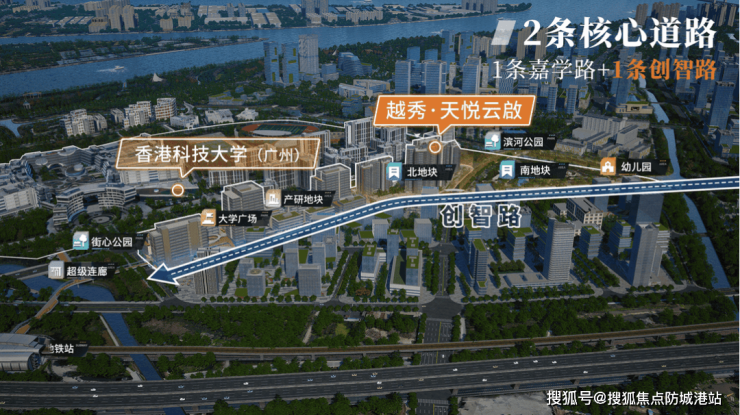 越秀·天悦云啟交通便利,位于庆盛核心枢纽区,紧邻东涌地铁站及港科大通勤核心道路。项目规划两条核心道路:嘉学路和创智路,将教育、科研、产业及居住区紧密连接,实现高效通达。