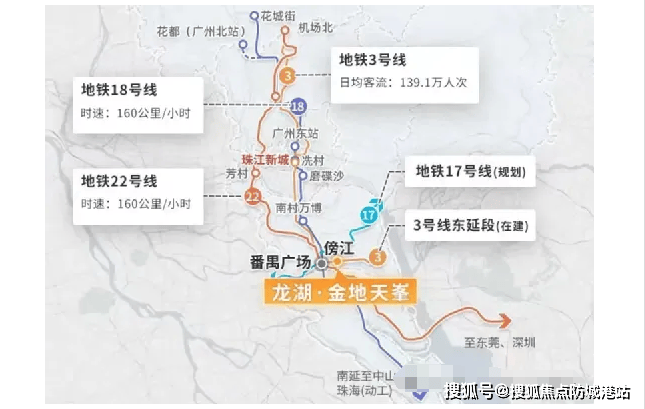 最令购房者心动的,莫过于项目与地铁3号线东延段傍江站实现“零距离”衔接。据悉,该线路已于2024年内正式开通,而龙湖金地天峯更是罕见实现“电梯直达地铁站”的设计,真正实现风雨无阻的便捷出行。从傍江站出发,仅1站即达番禺广场枢纽,无缝换乘3号线、18号线、22号线,并可接驳规划中的17号线,形成五轨交汇格局。这意味着,无论是前往琶洲商务区(约15分钟)、珠江新城(约25分钟),还是南沙、东莞等湾区节点,通勤时间均控制在高效区间。对于依赖轨道交通的上班族而言,这样的配置堪称“梦中情盘”。