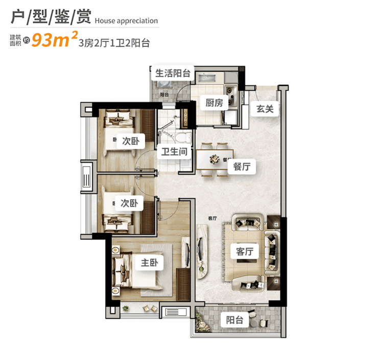 93㎡、95㎡ 3房户型方正,标准的三房两厅一卫户型,三个卧室都有做飘窗,同时为了尽可能增加卧室面积,户型牺牲了一些走廊的面积,导致走廊有些狭窄。