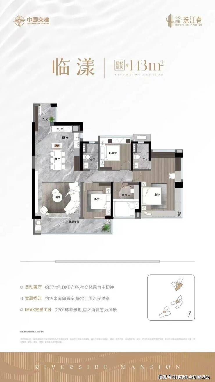 项目主打约130-180㎡全景瞰江臻宅,以“宽幕江景”为设计核心,实现户户朝南、点式布局,最大化江景视野。户型设计兼顾功能性与舒适性: