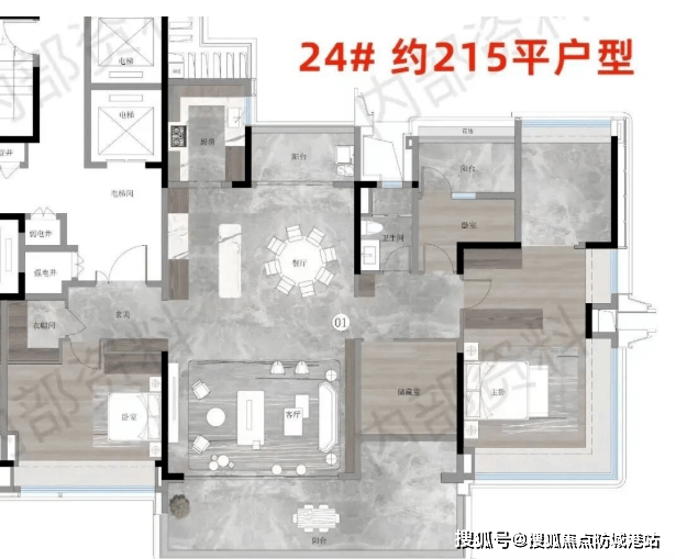 目前主推142–279㎡纯改善户型,使用率高达100%–110%,真正实现“所见即所得”。以230㎡四房为例,配置私家电梯厅、双主卧套房、独立佣人房、LDKB一体化大方厅及270°L型全景飘窗,空间尺度与功能布局均对标国际豪宅标准。